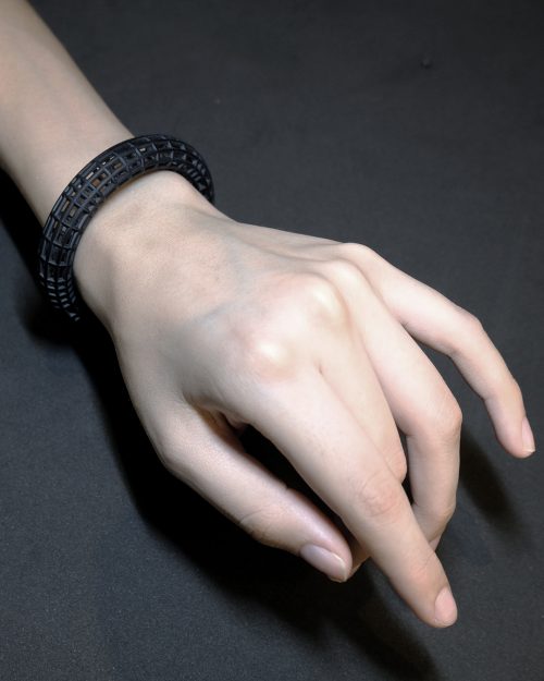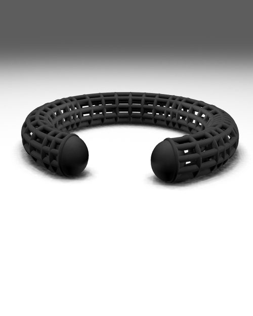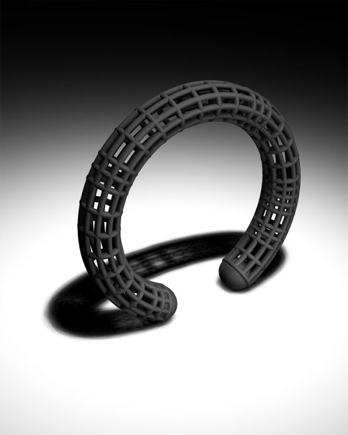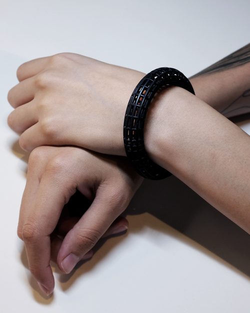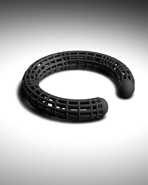 PURE Design presents ARCHI, an avant-garde cuff where minimalist form embraces architectural inspiration. This striking matte black piece is not a solid band, but a precisely engineered exoskeleton – a futuristic grid of interconnected lines that arc gracefully around the wrist.