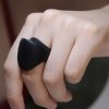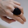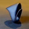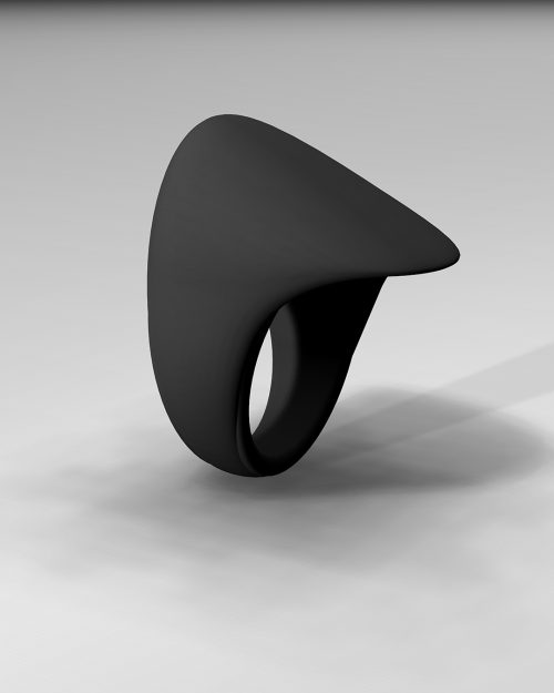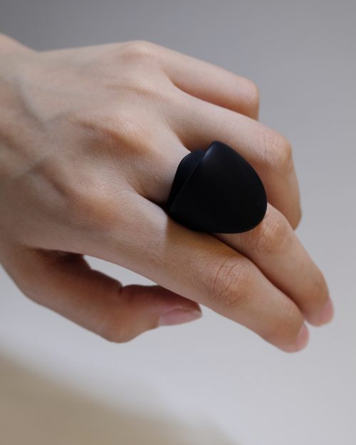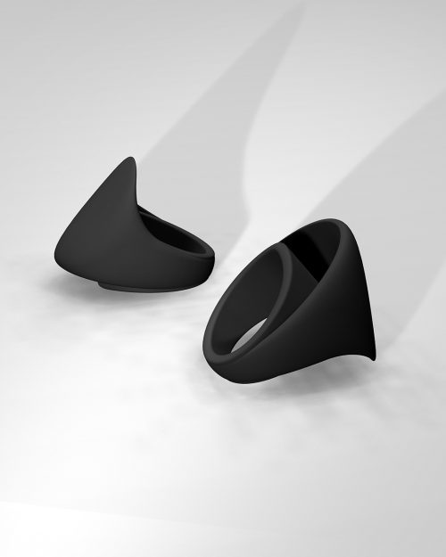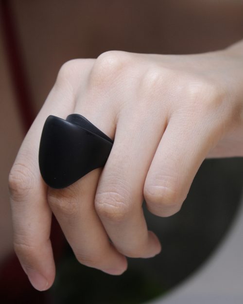 The “Double toit” ring is single, continuous band of matte black material gracefully unfurls and folds over itself, creating an intriguing, cowl-like aperture with a subtly peaked, avant-garde silhouette. This elegant manipulation of form is where futuristic design meets organic inspiration. A piece of art for those who appreciate the subtle power of avant-garde minimalism and the allure of futuristic design.